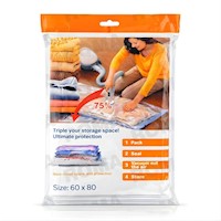Set de almacenamiento diseñado para comprimir ropa, mantas y textiles mediante sistema al vacío, ayudando a reducir su volumen y optimizar el espacio en armarios, maletas y depósitos. Incluye bolsas resistentes y un succionador manual que permite una extracción de aire fácil, manteniendo las prendas protegidas del polvo, la humedad y los olores.